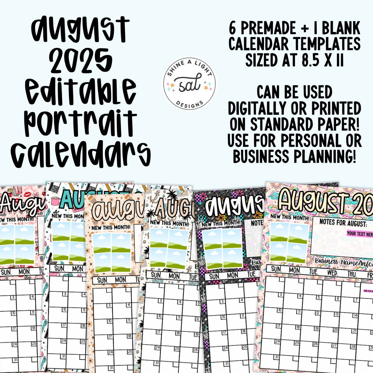 Grab 6 different premade August Calendars preloaded into Canva for you to easily create your monthly calendar or design your own in Canva with the blank template by adding backgrounds or other fun elements and changing fonts and colors! Sized at 8.5 x 11 so you can easily print a physical copy out for your desk, fridge or anywhere else!