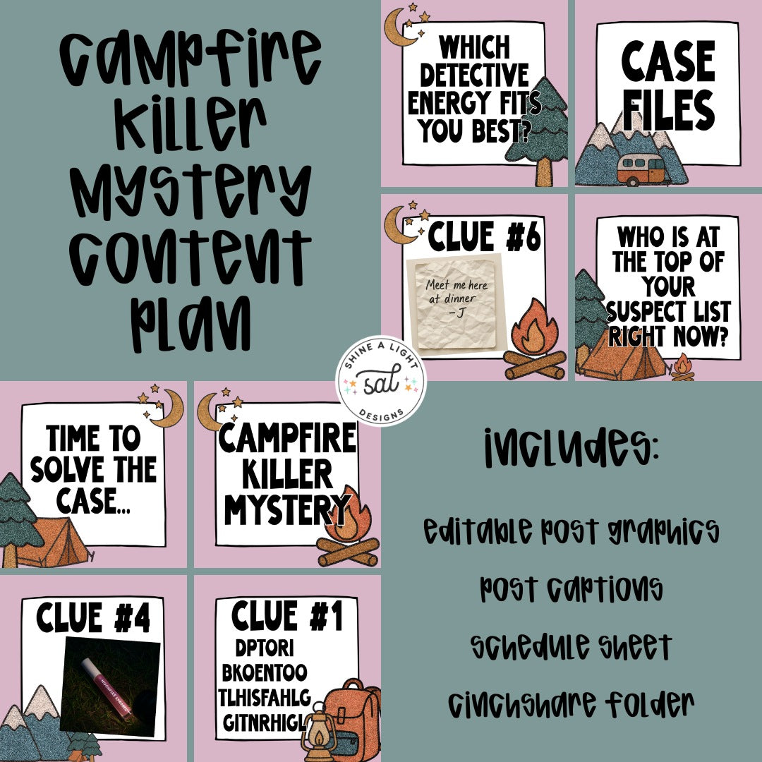 Campfire Killer Mystery 2025 Content Plan - Graphics, Schedule + Verbiage for Any Small Business!