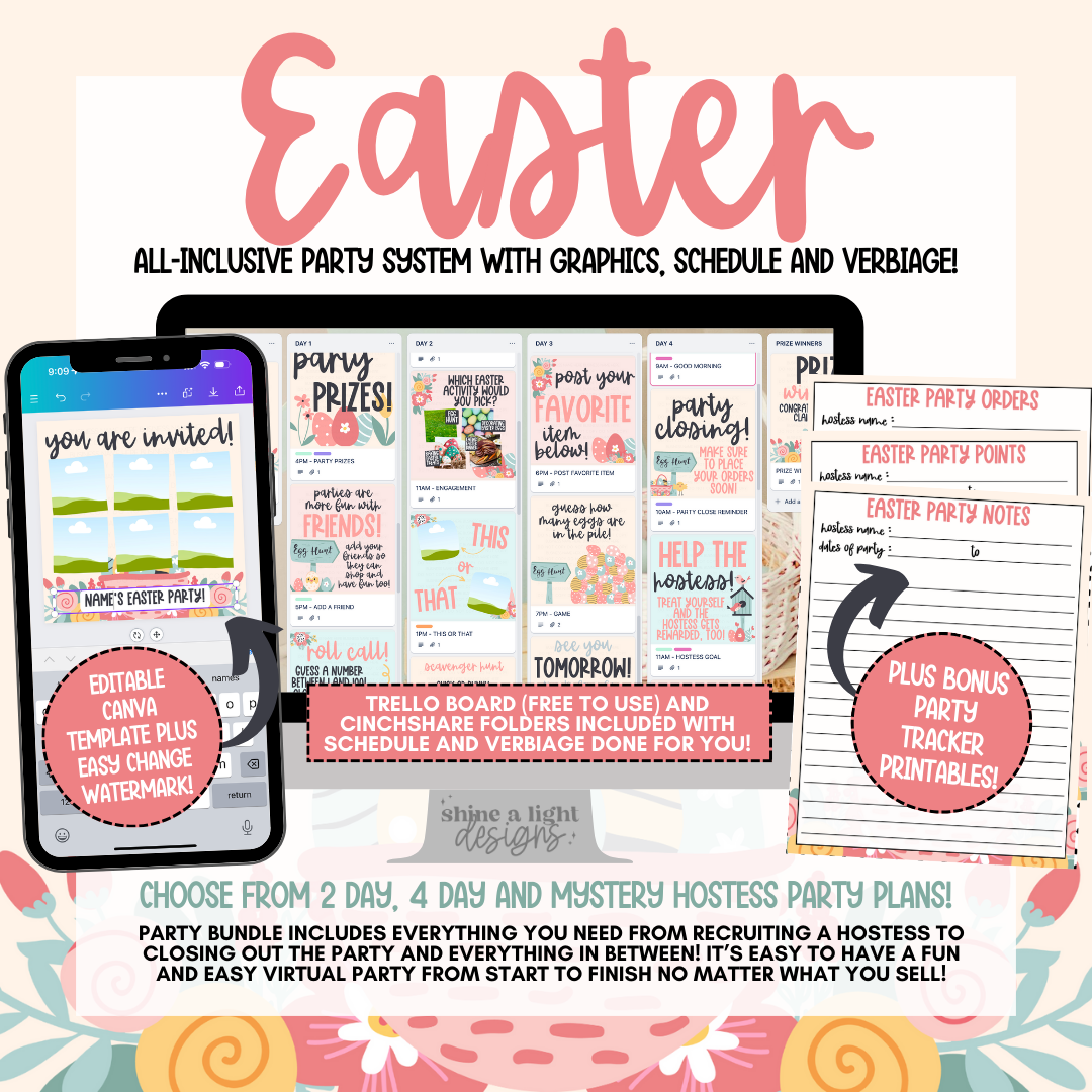 Our Easy Peasy Virtual Party Systems are the perfect solution for hosting a hassle-free virtual party. It is an all-inclusive system complete with graphics, verbiage and a schedule for 2 day, 4 day and mystery hostess party structures. Additionally, graphics are editable in Canva with an easy-change watermark. If you are looking to add virtual parties to your business this bundle will save you time and make it easy to run a fun, professional and cohesive party!