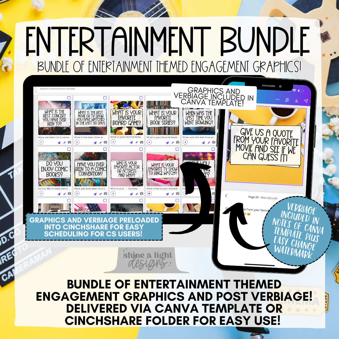 Drive includes over 35 entertainment related engagement graphics PLUS verbiage. Canva template with all graphics included for eash watermarking and including verbiage in the notes.