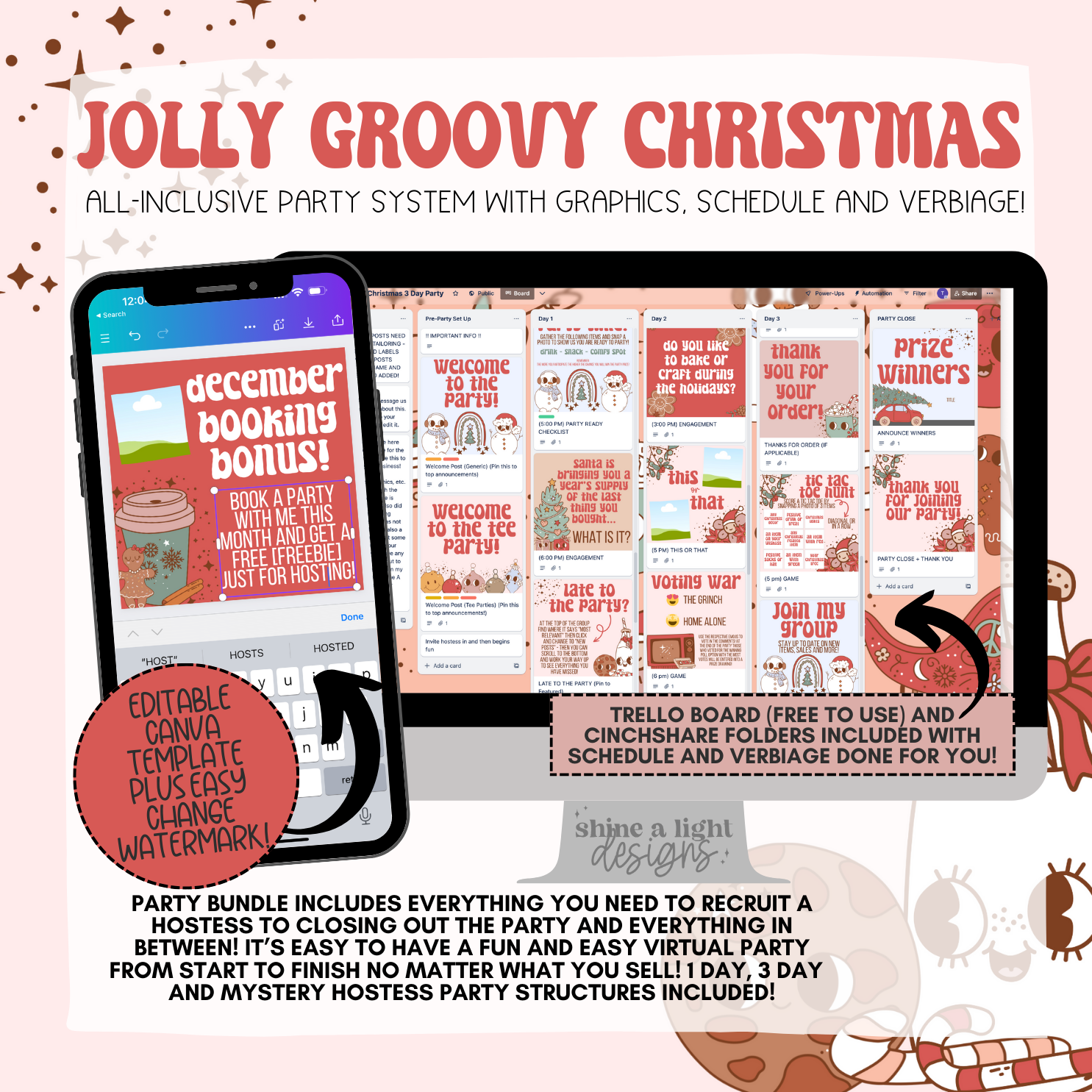 Our Groovy Jolly Christmas Easy Peasy Virtual Party System is the perfect solution for hosting a hassle-free virtual party. It is an all-inclusive system complete with graphics, verbiage and a schedule for 1 day, 3 day and mystery hostess party structures. Additionally, graphics are editable in Canva with an easy-change watermark. If you are looking to add virtual parties to your business this bundle will save you time and make it easy to run a fun, professional and cohesive party!