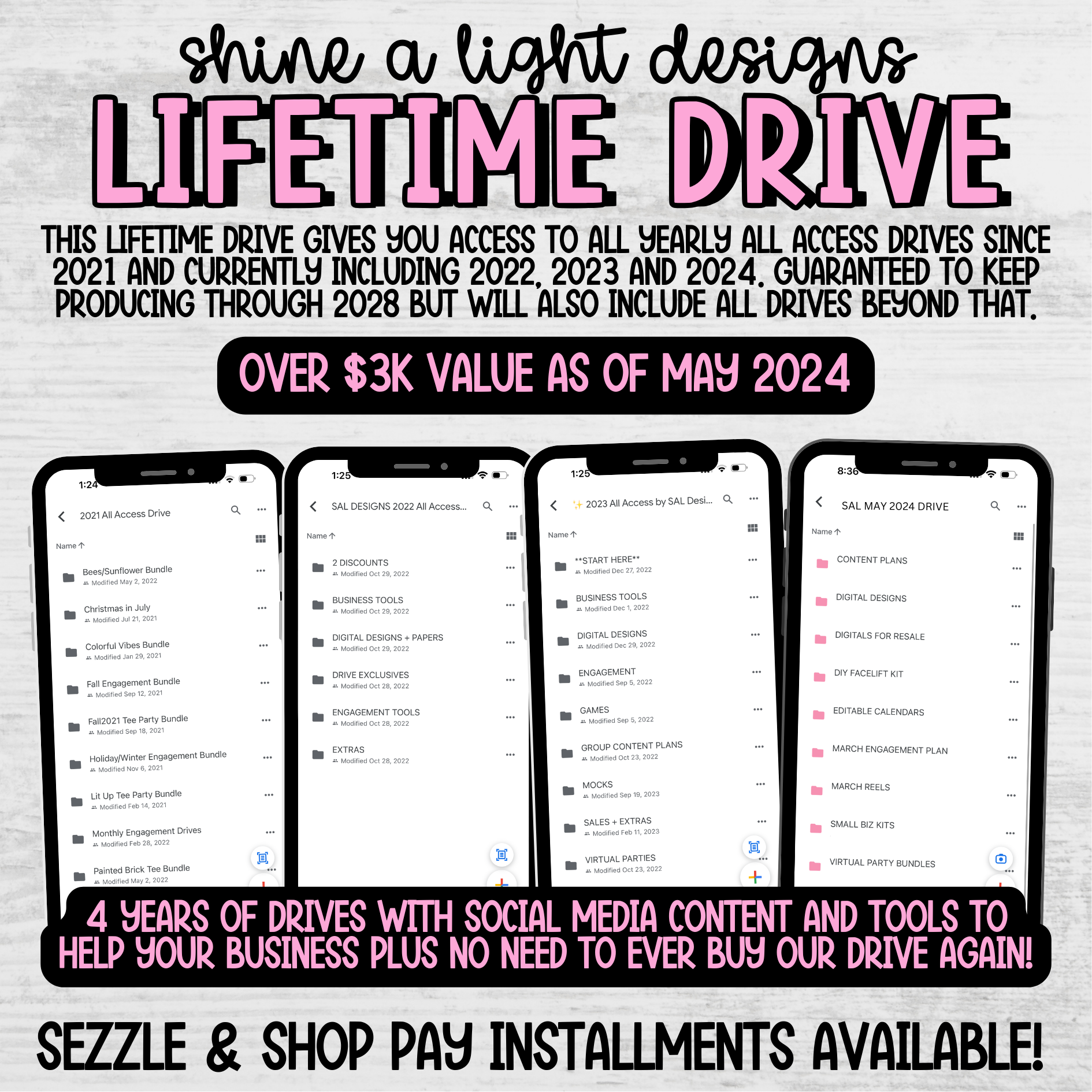 This purchase will give you access to a master folder including all of the All Access Drives by SAL Designs from 2021, 2022, 2023, 2024, 2025, 2026 and future years. Guaranteed to release drives through 2028. Currently over $7k value. This will now also include the 2023 Template Ticket Drive. Please email saldesignscs@gmail.com with any questions. If you are uncomfortable whatsoever please do not purchase. I have opened this listing for those who have asked and trust me and have known me and my drives already. You may purchase my yearly drives separately as well.