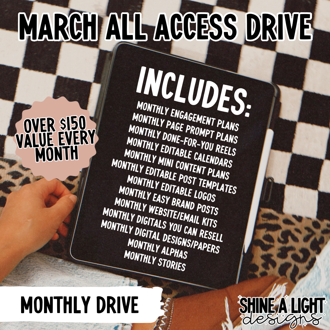 Your purchase will provide a content calendar you can use to help plan your month PLUS everything below! Specific themes of each item will be shared by the 1st of each month but we always work to plan themes that will be relevant to the month AND make for easy marketing and engagement!