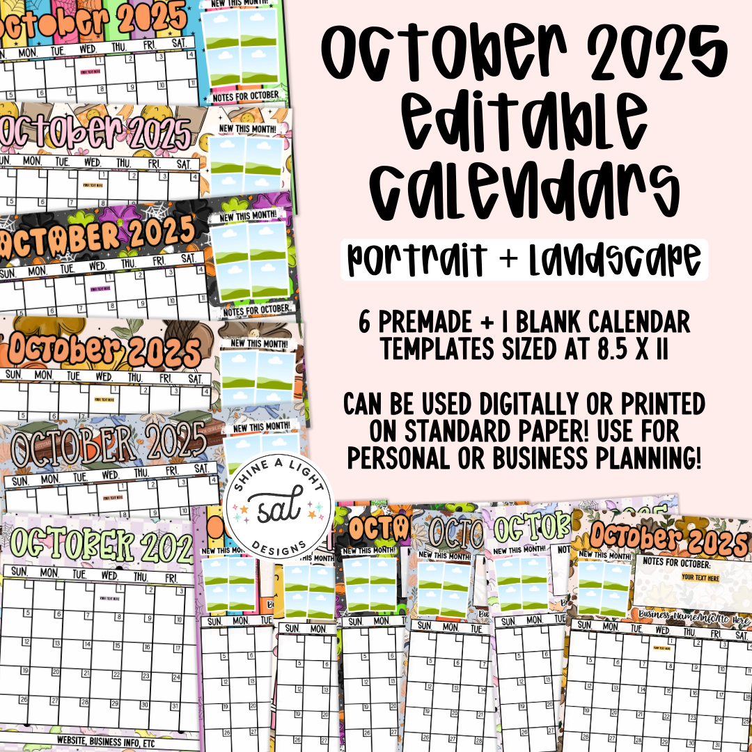 Grab 6 different themed premade September 2025 Calendars each in landscape or portrait options!