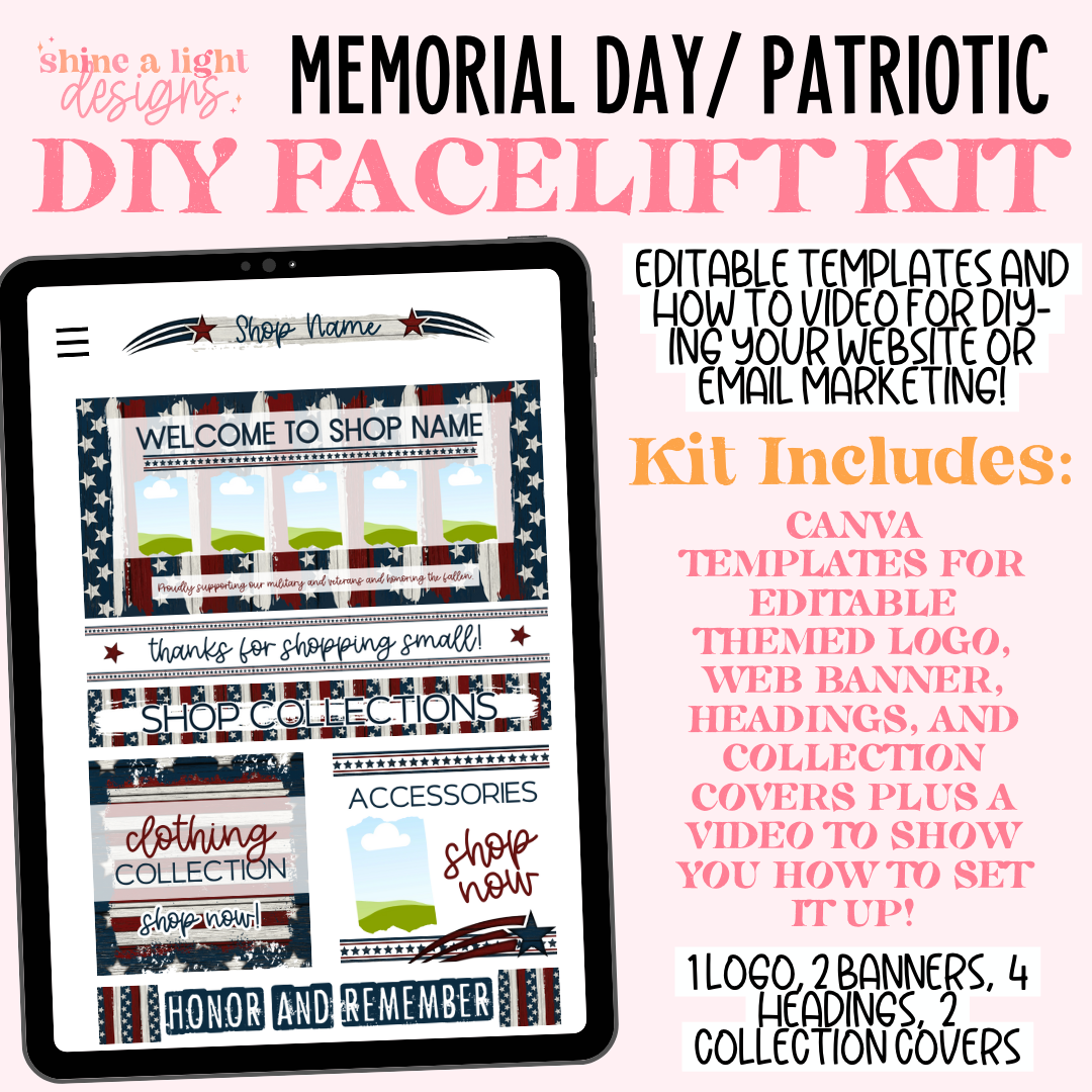 Grab this eye-catching patriotic/Memorial Day themed website facelift template kit to liven up your website! Kit comes with website headers, banners, collection covers and an easy editable coordinating logo plus a video showing you how to set it up on Shopify!
