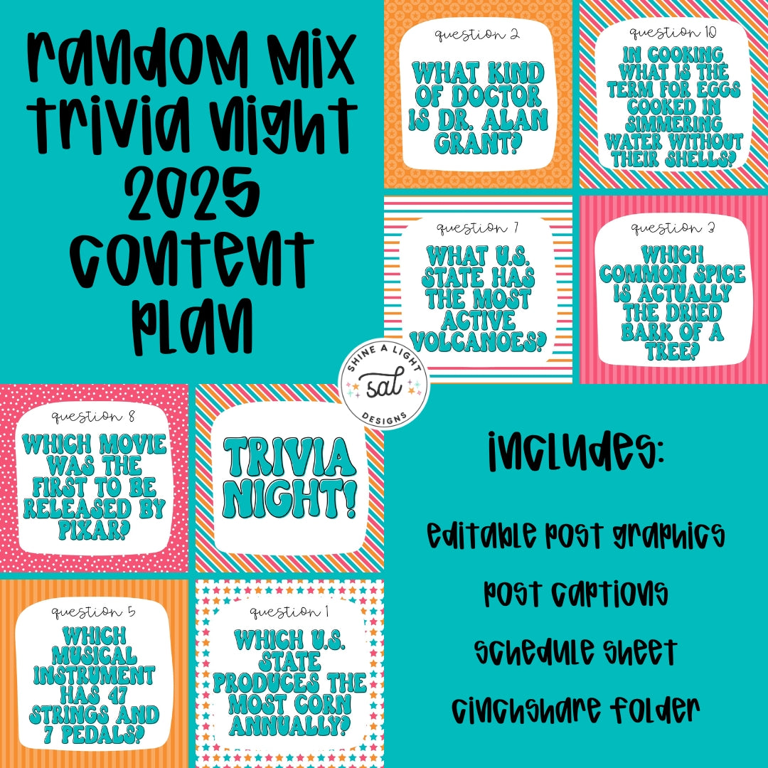 Random Mix Trivia 2025 Content Plan - Graphics, Schedule + Verbiage for Any Small Business!
