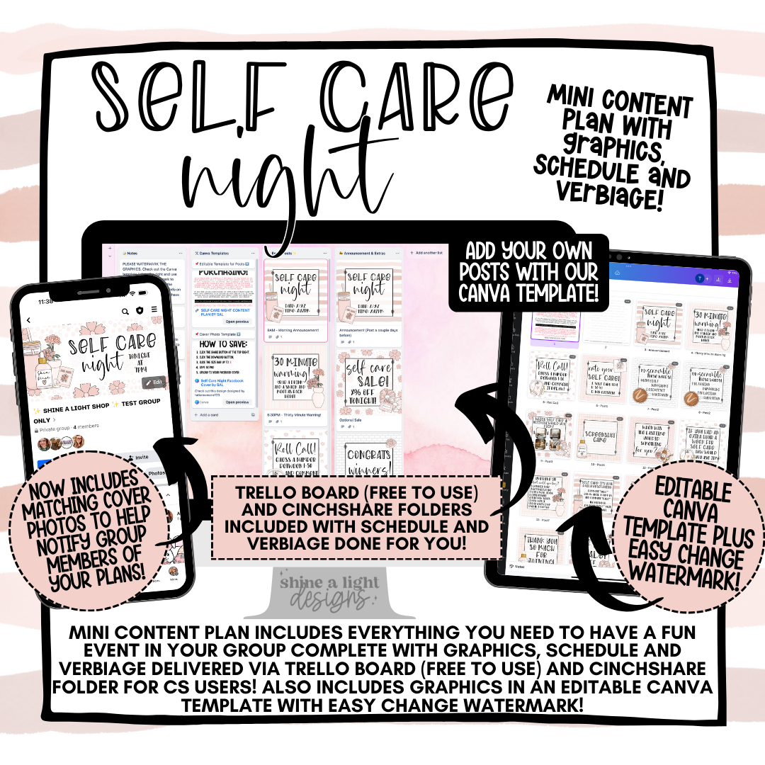 Self Care Night Content Plan - Graphics, Schedule + Verbiage for Any Small Business!