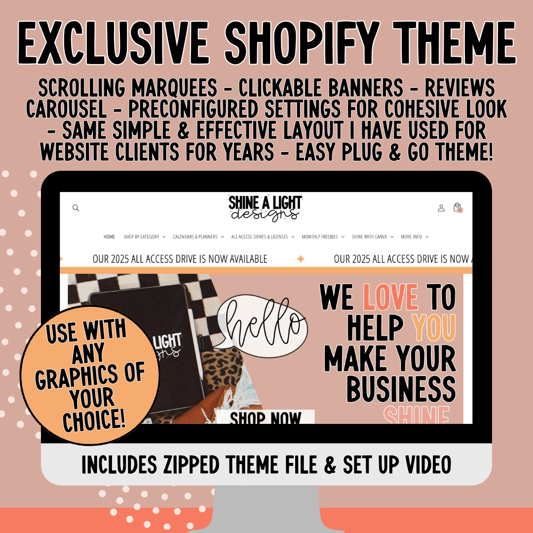 This Shopify theme was created by Tatianna of Shine A Light Designs to include all the same features I like to include on my own website and those I build for others. It has been tweaked and tested by other Shopify users and includes videos and help to set it up! Use it with ANY graphics you want! Similar to themes like Studio and Dawn that you use to build your Shopify storefront. Theme will come bare for you to add your graphics and customize!