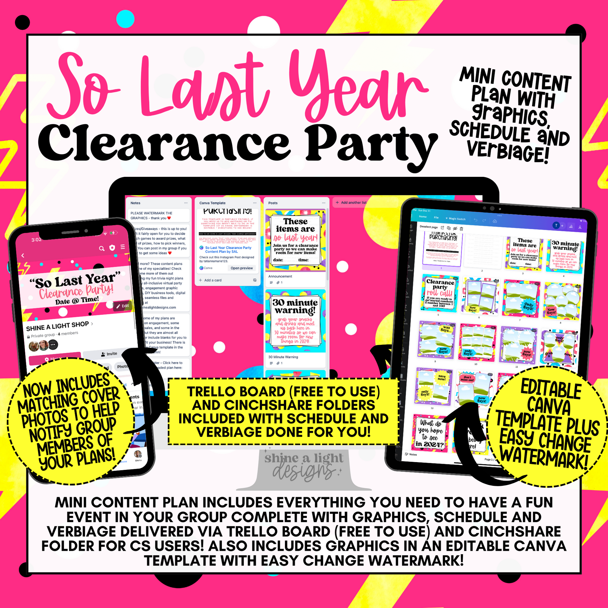 So Last Year Clearance Party Content Plan - Graphics, Schedule + Verbiage for Any Small Business!
