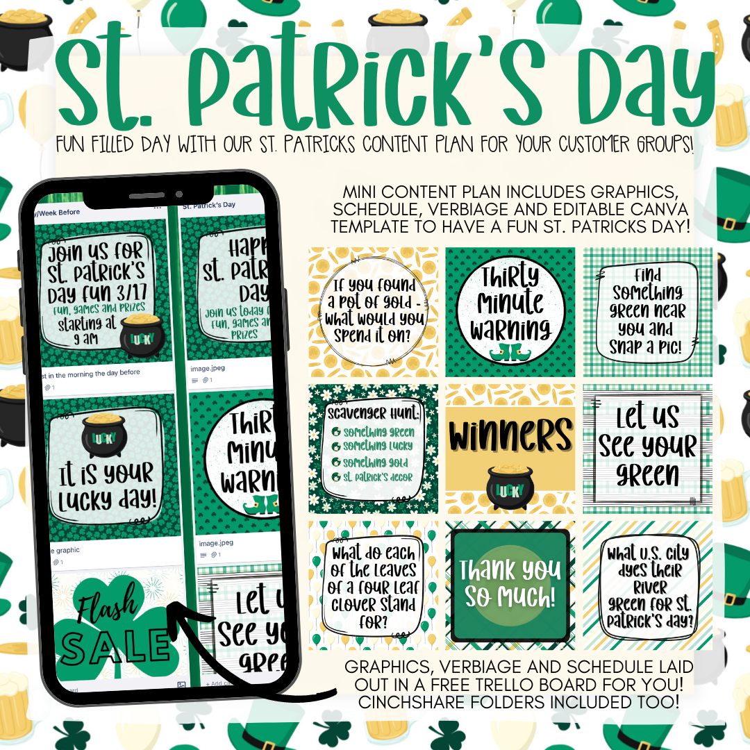 St. Patrick’s Day content plan - Graphics, Schedule + Verbiage for Any Small Business!