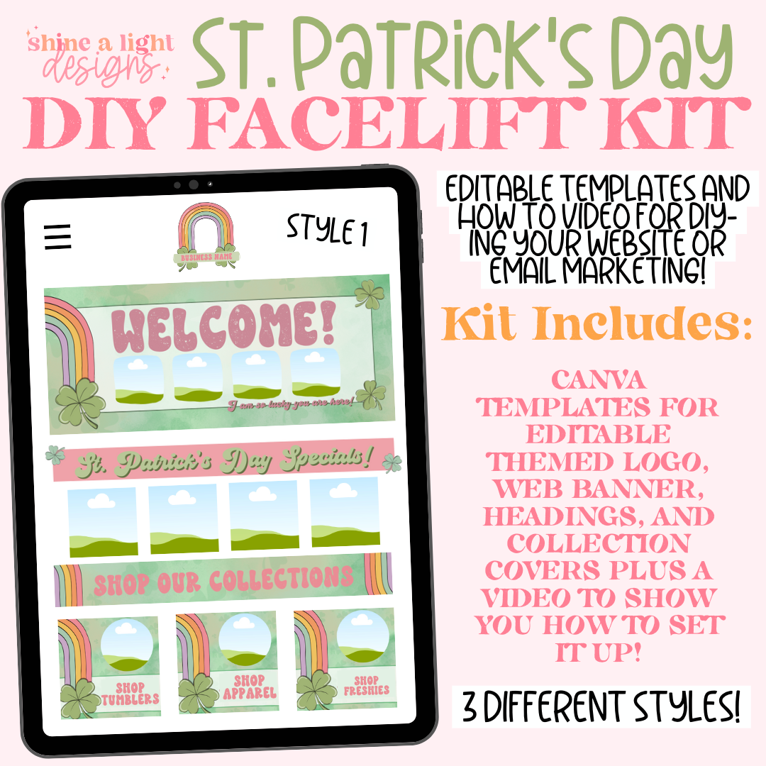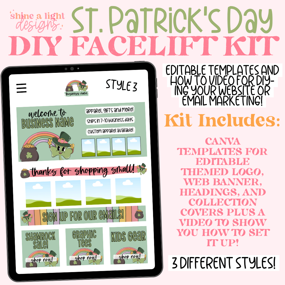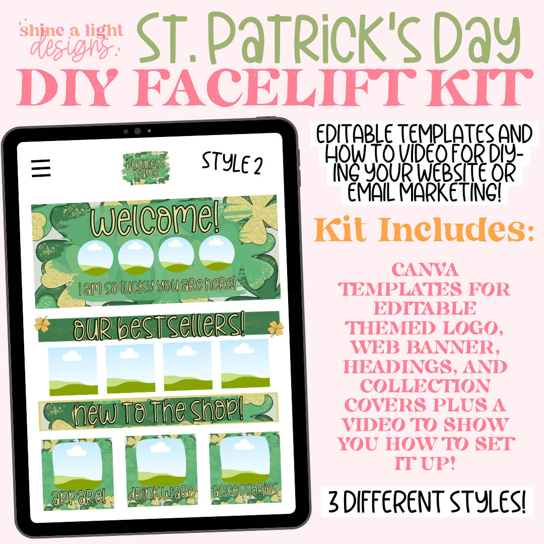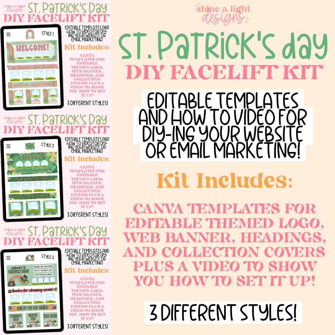 Grab this eye-catching St. Patrick's Day themed website facelift template kit to liven up your website! Kit comes with website headers, banners, collection covers and an easy editable coordinating logo plus a video showing you how to set it up on Shopify!